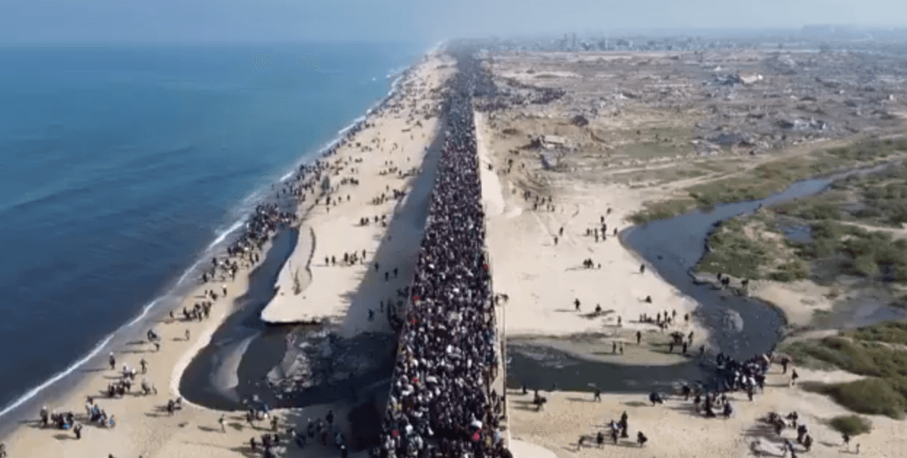 Întoarcerea trebuia să înceapă mai devreme, însă din cauza neînțelegerilor generate de refuzul Hamas de a elibera la timp un ostatic israelian, aceasta a fost întârziată 48 de ore. Israelul a blocat accesul palestinienilor în nordul Fâșiei Gaza, până când Hamas a decis să respecte termenii înțelegerii. Astfel, luni, palestinienii au început să se întoarcă în Fâșia Gaza, punctele de trecere fiind redeschise de israelieni. ONU notează că este vorba de peste 200 de mii de palestinieni, observați deplasându-se spre nord doar luni dimineață. Autoritățile Hamas au declarat că mai mult de 300 de mii de palestinieni strămutați s-au întors în nordul teritoriului până acum.