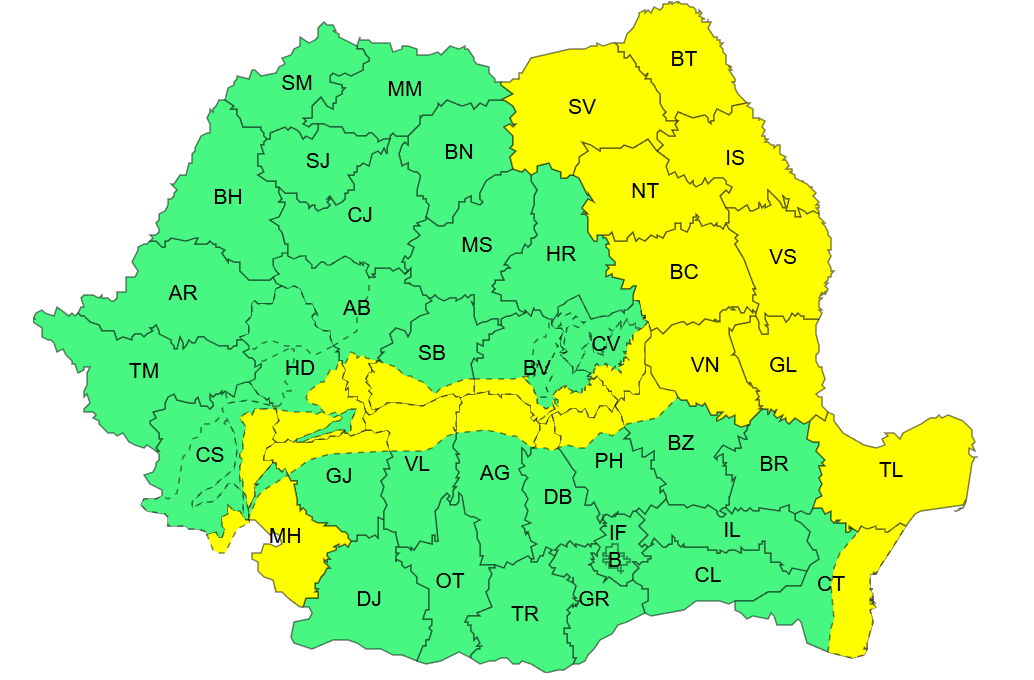 O avertizare meteo Cod Galben este valabilă începând de sâmbătă dimineața, valabil până la ora 23:00. În Carpații Meridionali și de Curbură, rafalele vor atinge 60-85 km/h, iar la altitudini mari, vor ajunge la 90-110 km/h. Vântul va avea intensificări și în Moldova, vestul Olteniei, și în nordul și estul Dobrogei, cu viteze de 50-70 km/h.