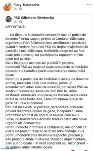 Ca răspuns la atacurile lansate în spațiul public de doamna Florina Ivașcu, primar al Comunei Sălcioara, organizația PSD Sălcioara face următoarele precizări:
