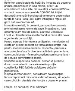 Referitor la proiectele de hotărâre invocate de doamna primar, precizăm că în luna martie, printr-un amendament adus listei de investiții, consilierii PSD au susținut realocarea sumei de 200.000 lei, inițial destinată amenajării unui pasaj de trecere peste calea ferată la halta Podu Rizii, către înființarea rețelei de gaze naturale în comună.
