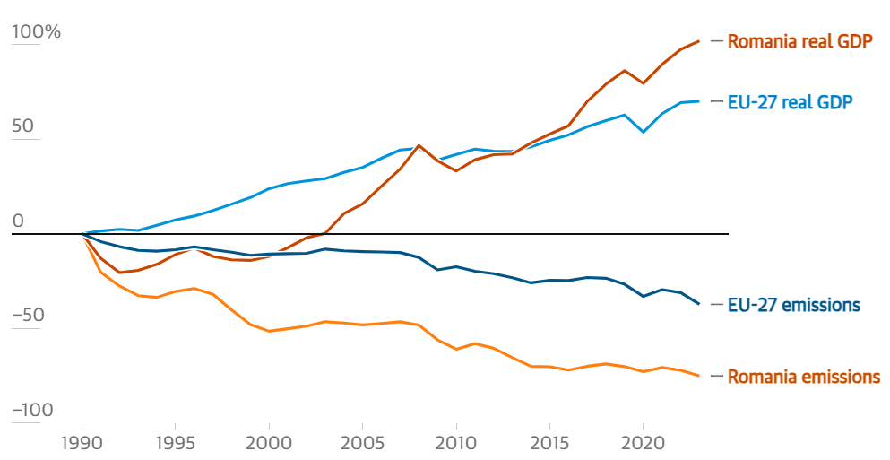 Aderarea României la Uniunea Europeană, în 2007, a impus norme mai stricte privind poluarea și a dus la închiderea fabricilor neprofitabile, subvenționate de stat. România a finalizat încă un reactor al centralei nucleară de la Cernavodă, care fusese pusă în funcțiune sub Ceaușescu, iar guvernul a introdus o schemă de certificate verzi pentru a finanța energiile regenerabile. În cei 17 ani de după căderea regimul comunist, intensitatea emisiilor de carbon din sectorul energetic – CO2 emis per kWh de electricitate generat – a scăzut cu 9,2%. În următorii 17 ani, scăderea a fost de 52%.